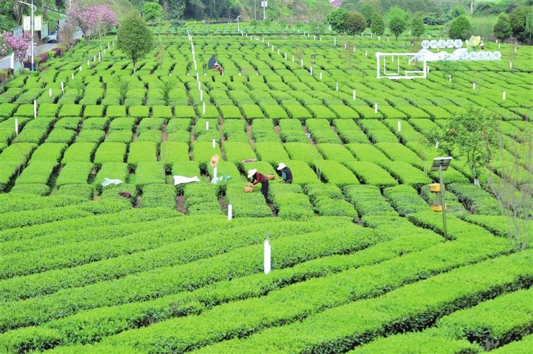 四月的宜昌,漫山遍野的茶垄绿意葱茏,茶农们抢抓晴好天气采摘新茶。