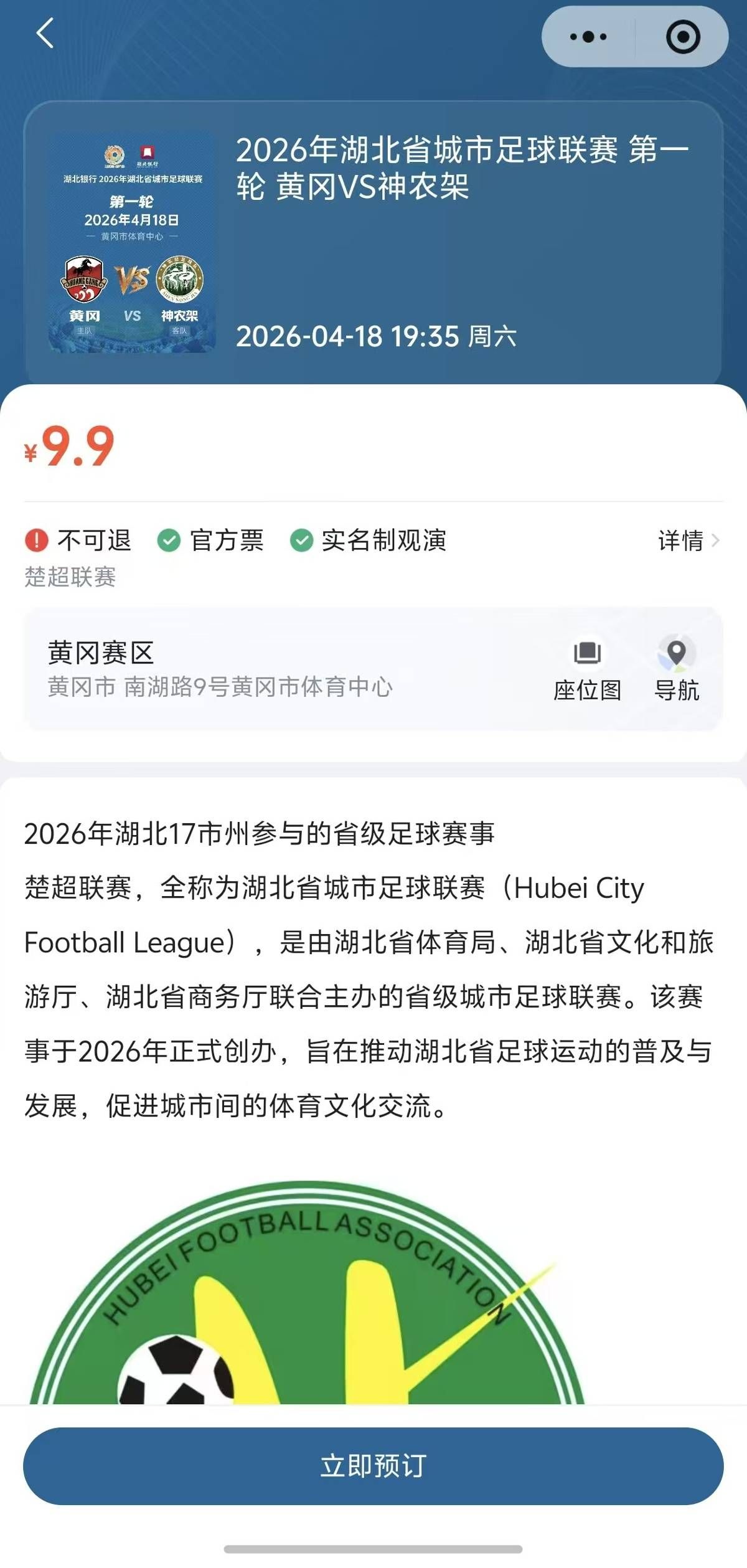 湖北日报讯(记者刘毅、通讯员吕蒙)4月18日晚7点35分,2026年湖北省城市足球联赛(“楚超”)首轮继续开战,黄冈队将坐镇主场迎战神农架林区队。首轮门票销售已于4月8日结束,错过的球迷不要着急,据记者查询,第二轮门票已于4月13日上午10时开启销售。