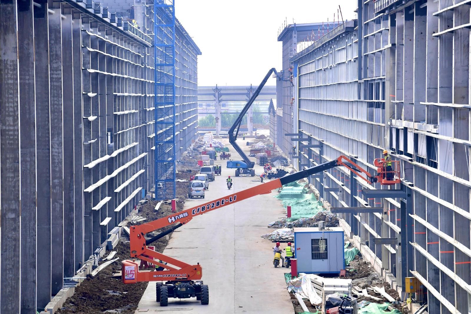 俯瞰1608亩建设工地,钢筋骨架撑起的现代化厂房在阳光照射下,泛着淡蓝色的光芒。