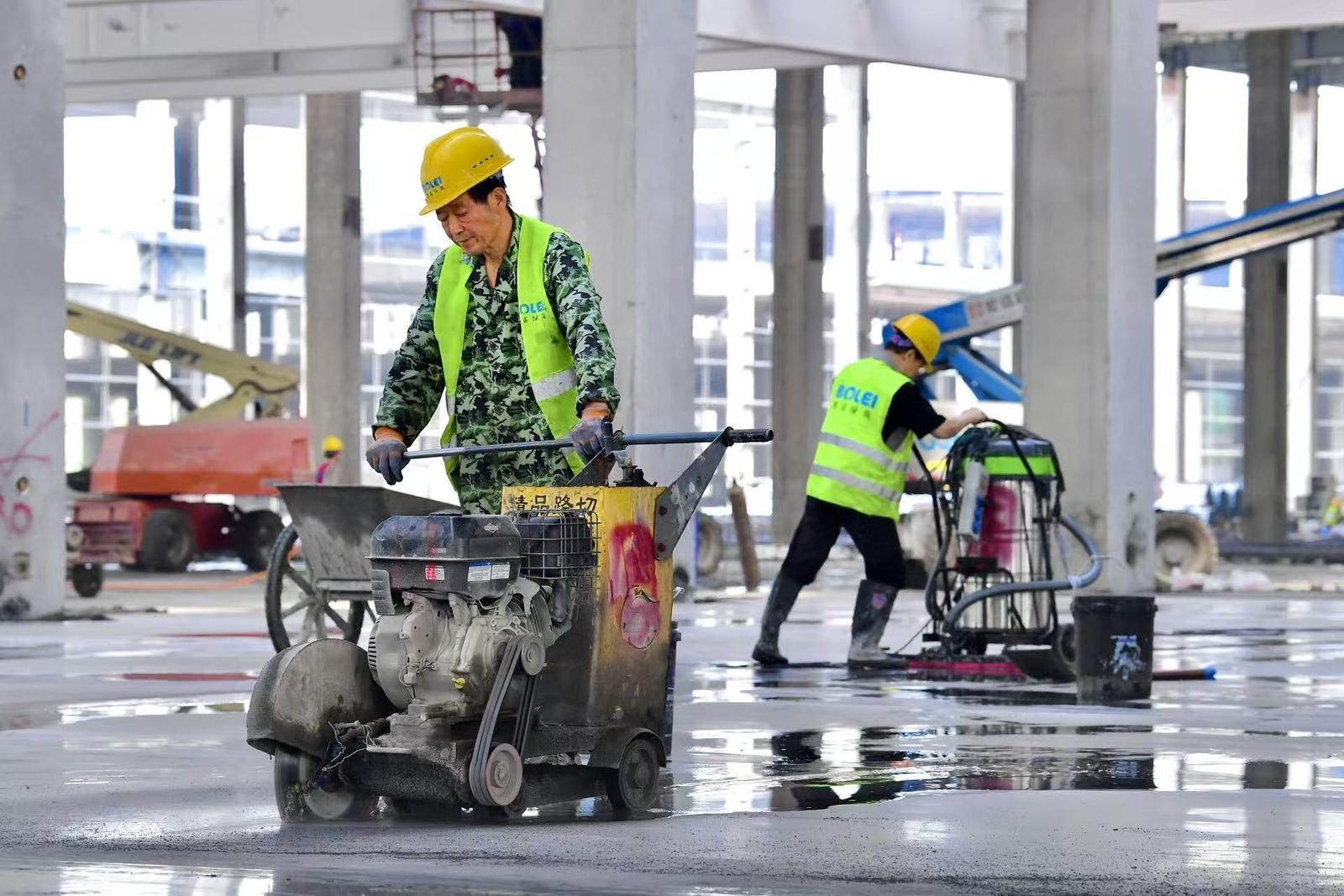 走进17万平方米的2号电芯车间,地面施工已全面启动。混凝土泵车长臂舒展,正将混凝土均匀摊铺在地面上。2标段项目经理邵剑告诉记者,这里,每天铺设混凝土2000余立方米。