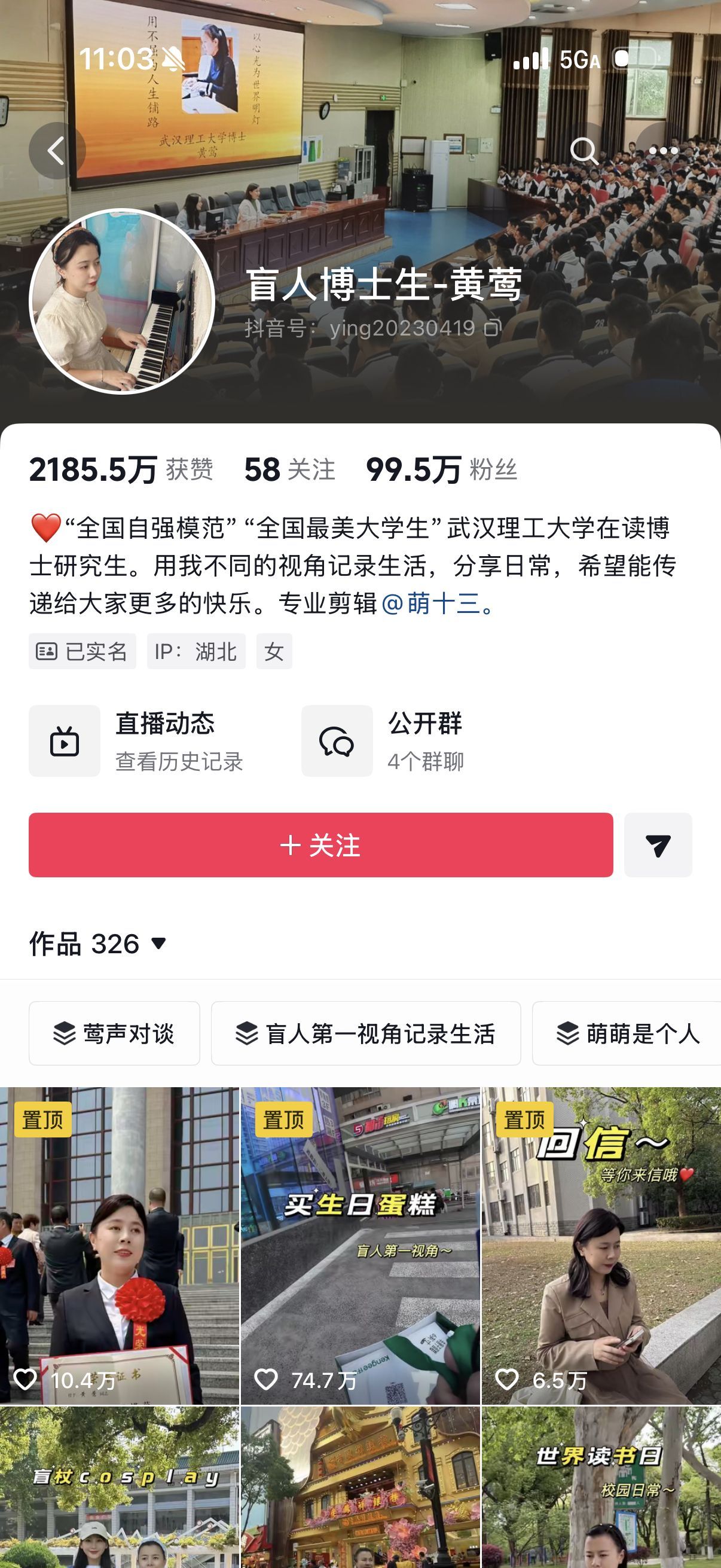 两岁时的一次高烧让黄莺双目失明,但她从没放弃过求学的梦想。2015年,她成为宁夏首位参加普通高考的盲人学生,并以高出当地理科一本线85分的成绩考入武汉理工大学社会工作专业。之后又考上该校的硕士和博士,现在是该校安全科学与应急管理学院博士研究生。