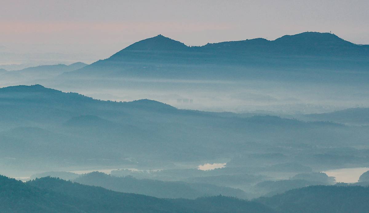 4月26日清晨,武汉黄陂云雾山晨曦初露,山峦层叠起伏,云雾萦绕山间。日出霞光漫染山野,景致清幽壮阔,宛如现实版千里江山图。(湖北日报全媒记者 柯皓 摄)
