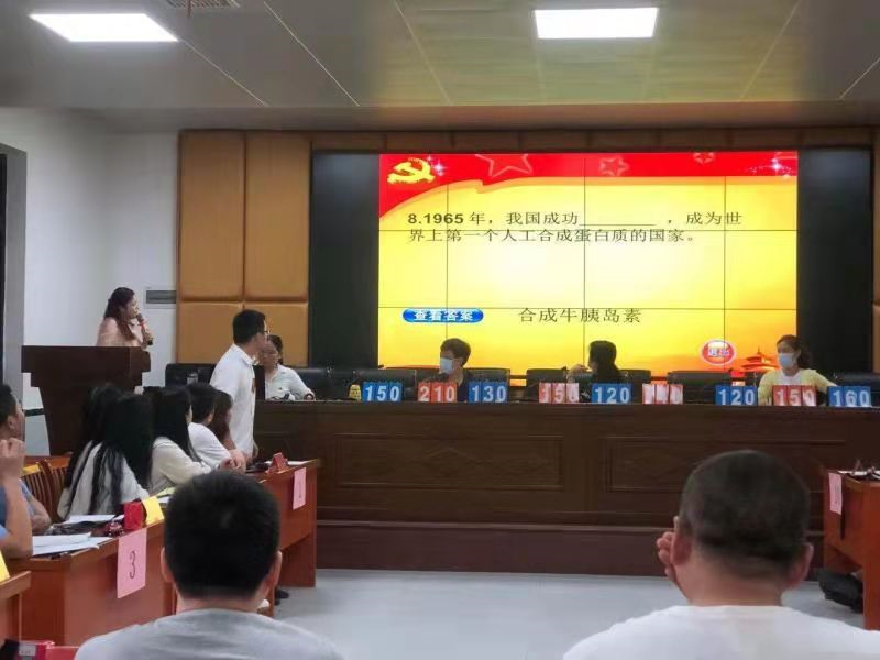 “党史学习教育的目标要求是?”“做到学史明理、学史增信、学史崇德、学史力行,教育引导全党同志学党史、悟思想、办实事、开新局。”财政所代表队流畅地回答道。“回答正确,加30分!”主持人宣布道。本次比赛分必答题、抢答题、风险题三个环节,每个比赛环节完成后,现场播放党史知识小视频,既缓解了选手们的紧张情绪,又强化了对党史知识的了解。随着比赛的深入,各代表队反应迅速、答题准确,掀起了一个又一个高潮,现场掌声不断。经过激烈的角逐,教育总支代表队获最高分,将代表孔垄镇出战全县党史学习教育知识竞赛。