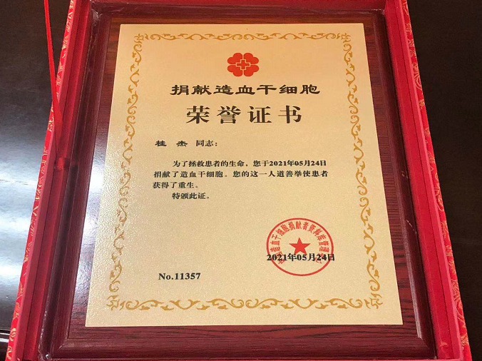 桂杰在大学期间就自愿登记成为一名造血干细胞志愿者,毕业后成为了县中医医院康复科的一名医生,并于今年5月成功进行了造血干细胞捐献。志愿者的大爱善举得到社会的认可,荣获全国无偿捐献造血干细胞荣誉证书。