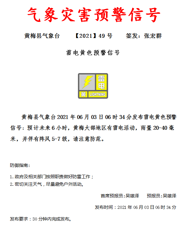 黄梅县气象台2021年06月03日06时34分发布雷电黄色预警信号:
