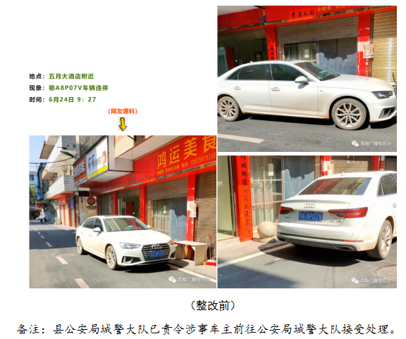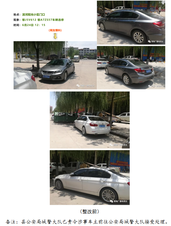 美好的生活源于美丽的城市 美丽的城市因你我而文明 前期【曝光台】推出后 相关部门高度重视 迅速整改 一起看看整改后的情况 1、梦想城小区附近 车辆违停 2、五月大酒店附近 车辆违停 3、鹏泰超市附近 车辆违停 4、实验小学附近 车辆违停 5、中亚大酒店附近 车辆违停 6、文化公园路 车辆违停 7、惠民路 车辆违停 8、滨河阳光小区门口 车辆违停