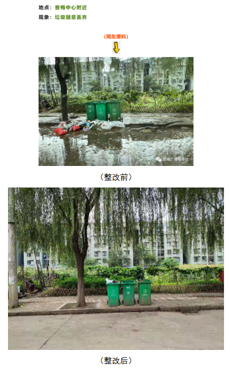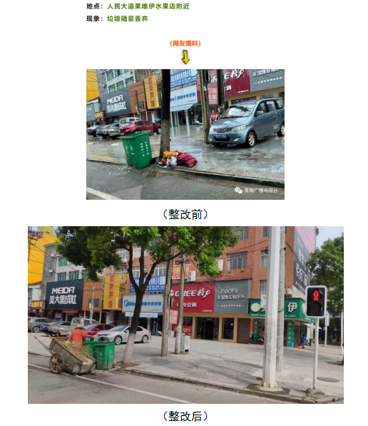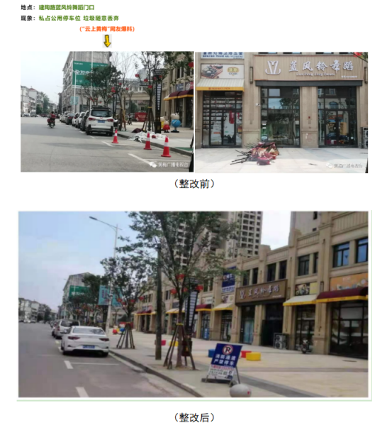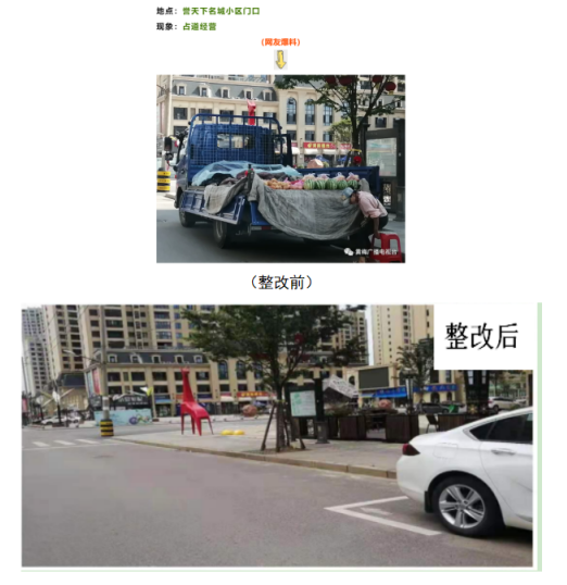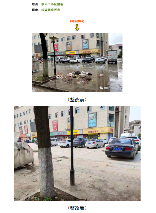 曝光台61期第二张照片反映誉天下名城小区门口占道经营、64期第8张照片反映建陶路蓝风铃舞蹈门口占用停车位、垃圾随意丢弃的问题,已整改完成。